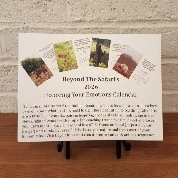 Our 2026 Honoring Your Emotions mindset calendar takes you on a 12 month journey of welcoming, caring for, and celebrating your emotions while enjoying the beauty of New England wildlife. Each month’s print pairs a unique image of an animal living its life in the woods with a different life coach truth or tool that help you better understand and navigate your feelings. A little like hypnosis, the visual and verbal combination helps soothe your nervous system and gives you sovereignty over your experience.